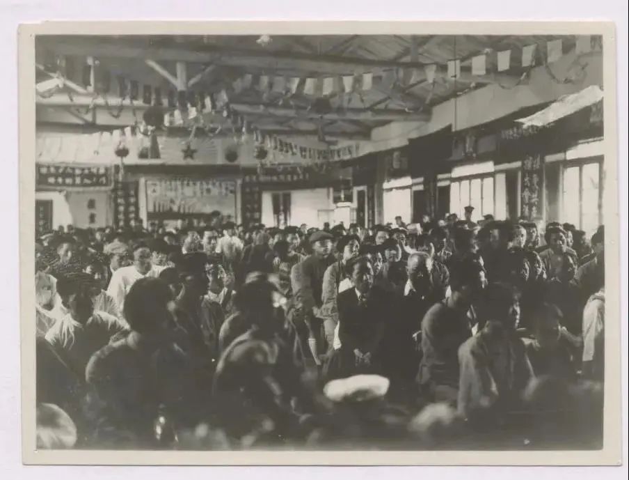 第一張照片中的屋頂為中國傳統(tǒng)木梁、人字結(jié)構(gòu),木梁上掛滿了彩旗和燈籠,四周墻面貼滿標(biāo)語和宣傳畫,后墻正中也貼著一大幅宣傳畫。照片中,代表們面向主席臺,密密麻麻地坐滿了會場,他們神情莊重、聚精會神,不同的穿著反映了代表們來自多個階層,具有鮮明的時代烙印。