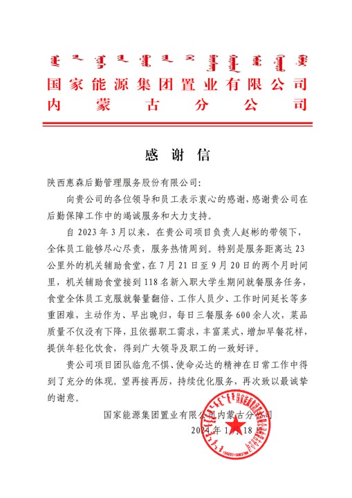 近日,惠森公司內(nèi)蒙古雁寶能源保障區(qū)收到了一封來自國(guó)家能源集團(tuán)置業(yè)有限公司內(nèi)蒙古分公司的感謝信。信中對(duì)惠森公司雁寶能源保障區(qū)項(xiàng)目負(fù)責(zé)人趙彬及其團(tuán)隊(duì)在后勤保障工作中盡心盡責(zé),服務(wù)熱情周到表示感謝和肯定,對(duì)于公司雁寶能源保障區(qū)項(xiàng)目團(tuán)隊(duì)臨危不懼、使命必達(dá)的精神致以誠(chéng)摯的謝意。