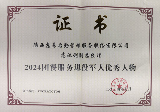 大會(huì)上,陜西惠森后勤管理服務(wù)股份有限公司憑借在團(tuán)餐領(lǐng)域的杰出表現(xiàn)和持續(xù)創(chuàng)新,榮獲“2024中國(guó)團(tuán)餐服務(wù)百?gòu)?qiáng)企業(yè)”榮譽(yù)稱號(hào)。同時(shí),惠森公司副總經(jīng)理高漢利因在推動(dòng)退役軍人就業(yè)方面的卓越貢獻(xiàn),被授予“團(tuán)餐服務(wù)退役軍人優(yōu)秀人物”稱號(hào)。這些榮譽(yù)不僅是對(duì)惠森公司過去一年努力與成就的高度認(rèn)可,更是對(duì)其未來引領(lǐng)行業(yè)發(fā)展的深切期待。