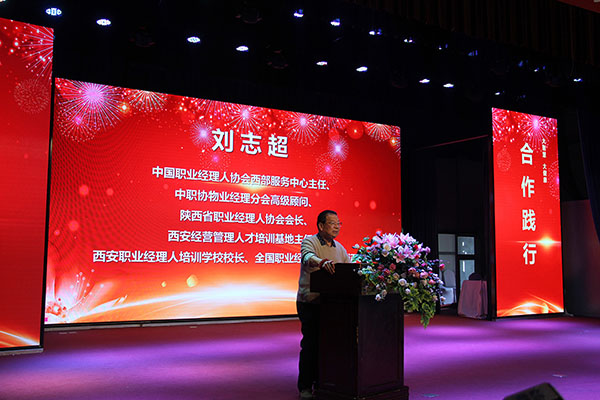 中國職業(yè)經(jīng)理人協(xié)會西部服務(wù)中心主任、中職協(xié)物業(yè)經(jīng)理分會高級顧問、陜西省職業(yè)經(jīng)理人協(xié)會會長、西安經(jīng)營管理人才培訓(xùn)基地主任、西安職業(yè)經(jīng)理人培訓(xùn)學(xué)校校長、全國職業(yè)經(jīng)理人資質(zhì)認(rèn)證專家劉志超先生為大會做了精彩激昂的致辭。